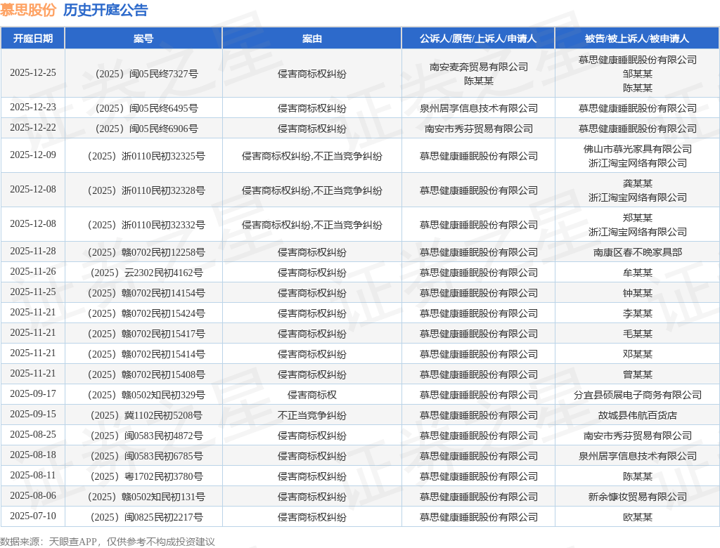 案号:(2025)闽05民终7327号根据统计,近一年内以慕思健康睡眠股份有限公司为当事人的历史开庭公告有38则,其中案由为“侵害商标权纠纷”的公告以26则居首,其次为“股东损害公司债权人利益责任纠纷”有5则,“不正当竞争纠纷”有3则。历史开庭公告(前20条)如下: