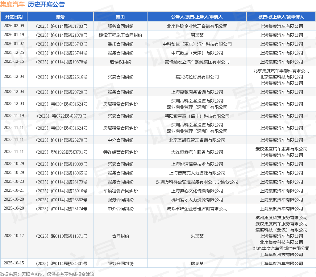 案号:(2025)沪0114民初26744号根据统计,近一年内以上海集度汽车有限公司为当事人的历史开庭公告有41则,其中案由为“服务合同纠纷”的公告以11则居首,其次为“买卖合同纠纷”有6则,“金融借款合同纠纷”有6则。历史开庭公告(前20条)如下: