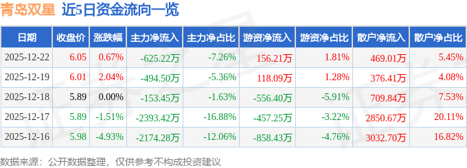 证券之星消息,截至2025年12月22日收盘,青岛双星(000599)报收于6.05元,上涨0.67%,换手率1.74%,成交量14.18万手,成交额8611.31万元。