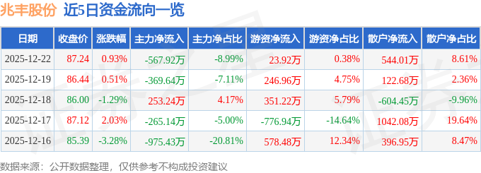 证券之星消息,截至2025年12月22日收盘,兆丰股份(300695)报收于87.24元,上涨0.93%,换手率0.71%,成交量7226.0手,成交额6319.25万元。