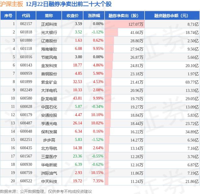 沪深主板融券净卖出前三分别为:正邦科技(002157)融券净卖出127.07万股、光大银行(601818)融券净卖出41.66万股、辽港股份(601880)融券净卖出28.8万股,前20具体见下表: