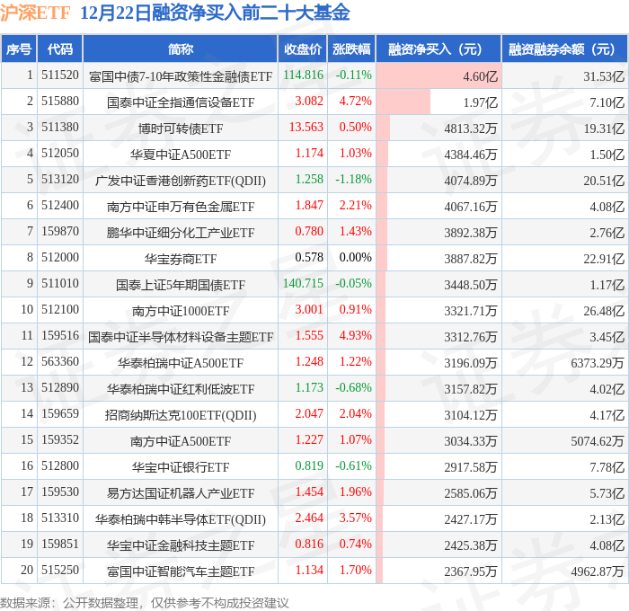 沪深ETF融资净买入前三分别为:富国中债7-10年政策性金融债ETF(511520)融资净买入4.6亿元、国泰中证全指通信设备ETF(515880)融资净买入1.97亿元、博时可转债ETF(511380)融资净买入4813.32万元,前20具体见下表:
