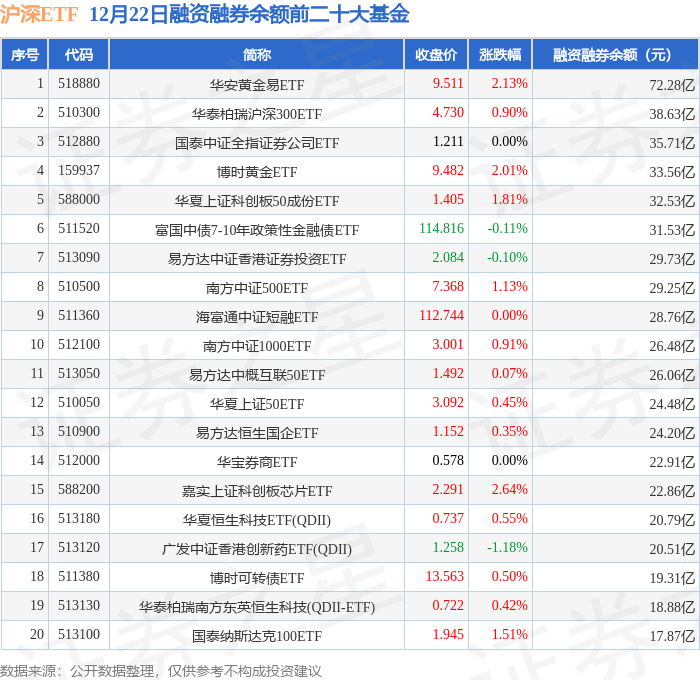沪深ETF融资融券余额前三分别为:华安黄金易ETF(518880)融资融券余额72.28亿元、华泰柏瑞沪深300ETF(510300)融资融券余额38.63亿元、国泰中证全指证券公司ETF(512880)融资融券余额35.71亿元,前20具体见下表: