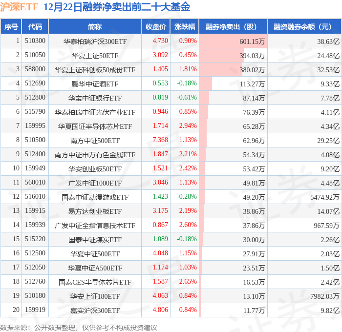 沪深ETF融券净卖出前三分别为:华泰柏瑞沪深300ETF(510300)融券净卖出601.15万股、华夏上证50ETF(510050)融券净卖出394.03万股、华夏上证科创板50成份ETF(588000)融券净卖出380.02万股,前20具体见下表: