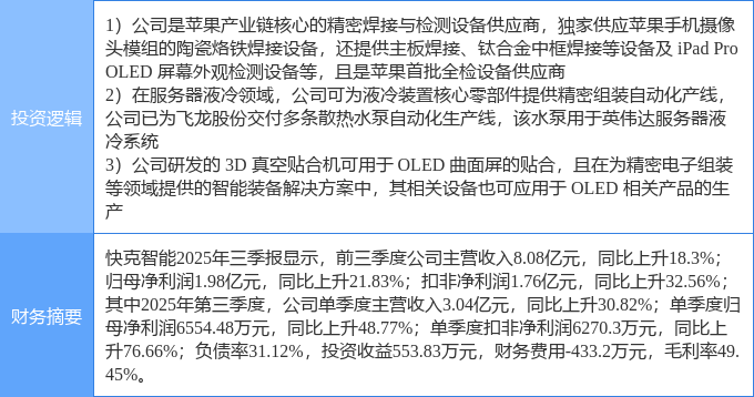 证券之星消息,快克智能12月23日涨停收盘,收盘价35.73元。该股于9点33分涨停,1次打开涨停,截止收盘封单资金为4588.09万元,占其流通市值0.52%。