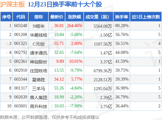 当日沪深主板换手率前10大个股中4只个股收涨,平均涨幅70.76%,其中N锡华(603248)以换手率80.28%排第一,6只个股近5个交易日中多次上榜。