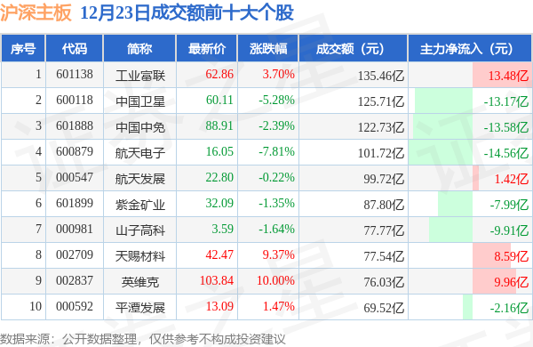 当日沪深主板成交额前10大个股中4只个股收涨,平均涨幅6.13%,其中工业富联(601138)以成交额135.46亿元排第一。从主力资金流入看,成交额前10大个股中有4只个股呈现主力资金净流入。