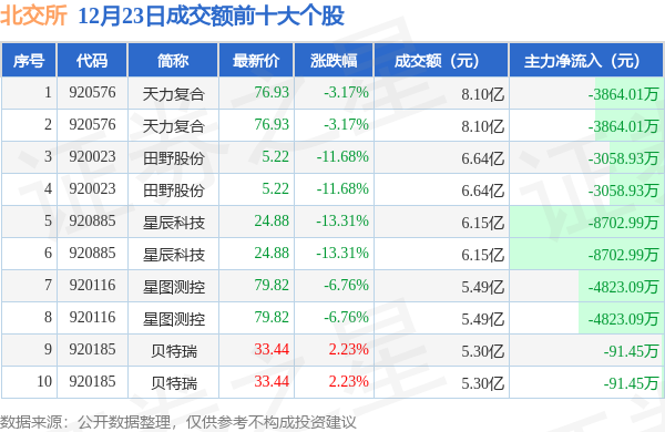 当日北交所成交额前10大个股中2只个股收涨,平均涨幅2.23%,其中天力复合(920576)以成交额8.1亿元排第一。