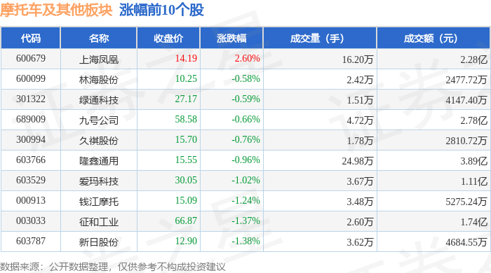 证券之星消息,12月23日摩托车及其他板块较上一交易日下跌1.64%,永安行领跌。当日上证指数报收于3919.98,上涨0.07%。深证成指报收于13368.99,上涨0.27%。摩托车及其他板块个股涨跌见下表: