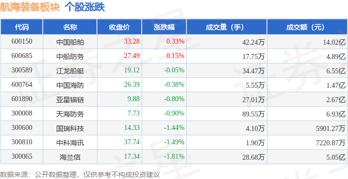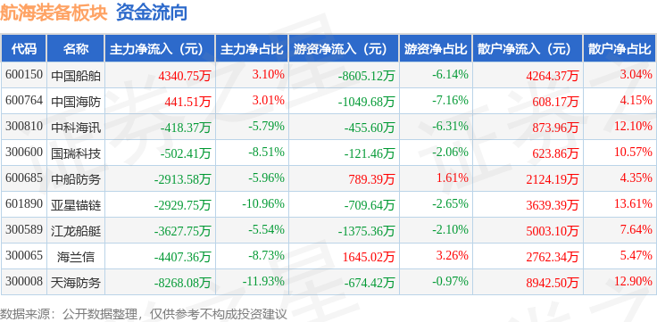 从资金流向上来看,当日航海装备板块主力资金净流出1.83亿元,游资资金净流出1.06亿元,散户资金净流入2.88亿元。航海装备板块个股资金流向见下表: