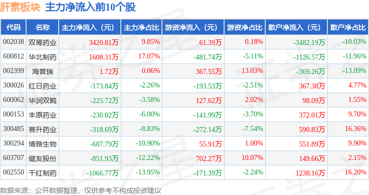 从资金流向上来看,当日肝素板块主力资金净流出1.38亿元,游资资金净流入7350.69万元,散户资金净流入6421.51万元。肝素板块个股资金流向见下表: