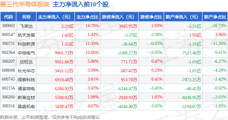 从资金流向上来看,当日第三代半导体板块主力资金净流出38.89亿元,游资资金净流入5.32亿元,散户资金净流入33.57亿元。第三代半导体板块个股资金流向见下表: