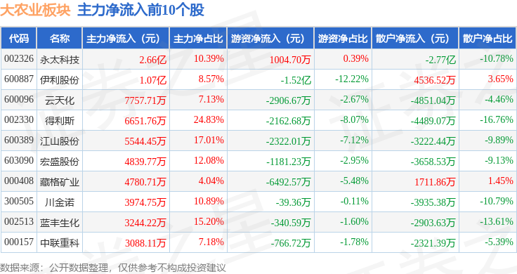 从资金流向上来看,当日大农业板块主力资金净流出17.31亿元,游资资金净流入2.24亿元,散户资金净流入15.07亿元。大农业板块个股资金流向见下表: