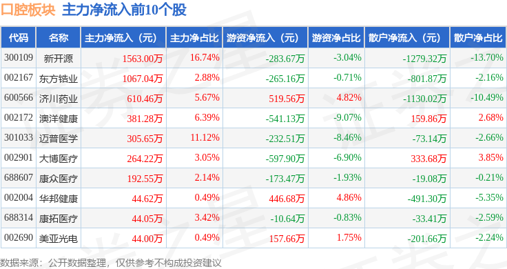 从资金流向上来看,当日口腔板块主力资金净流出6.14亿元,游资资金净流出2797.82万元,散户资金净流入6.42亿元。口腔板块个股资金流向见下表: