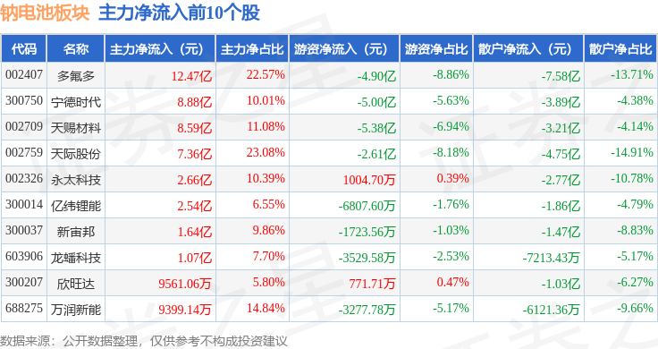 从资金流向上来看,当日钠电池板块主力资金净流入46.08亿元,游资资金净流出18.32亿元,散户资金净流出27.77亿元。钠电池板块个股资金流向见下表: