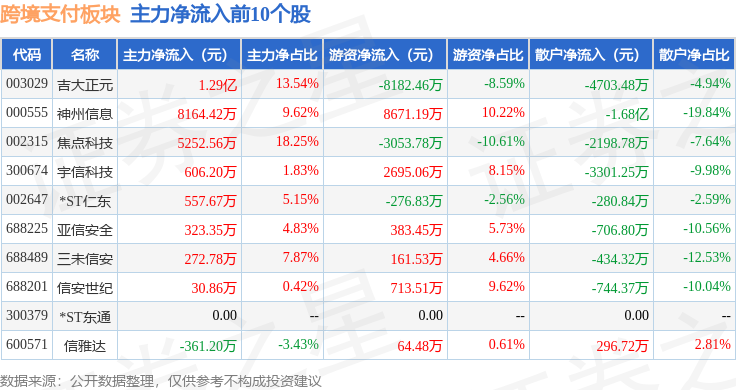 从资金流向上来看,当日跨境支付板块主力资金净流出8.67亿元,游资资金净流入3.95亿元,散户资金净流入4.71亿元。跨境支付板块个股资金流向见下表: