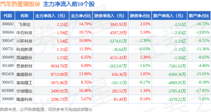 从资金流向上来看,当日汽车热管理板块主力资金净流出19.56亿元,游资资金净流入9.13亿元,散户资金净流入10.43亿元。汽车热管理板块个股资金流向见下表: