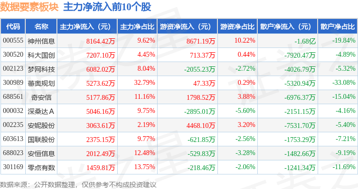 从资金流向上来看,当日数据要素板块主力资金净流出15.14亿元,游资资金净流入4.97亿元,散户资金净流入10.17亿元。数据要素板块个股资金流向见下表: