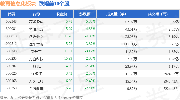 证券之星消息,12月23日教育信息化板块较上一交易日下跌0.99%,高乐股份领跌。当日上证指数报收于3919.98,上涨0.07%。深证成指报收于13368.99,上涨0.27%。教育信息化板块个股涨跌见下表: