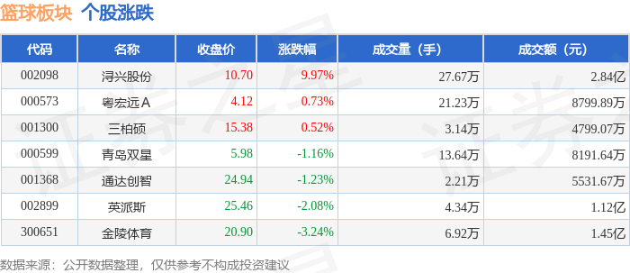 证券之星消息,12月23日篮球板块较上一交易日上涨0.83%,浔兴股份领涨。当日上证指数报收于3919.98,上涨0.07%。深证成指报收于13368.99,上涨0.27%。篮球板块个股涨跌见下表: