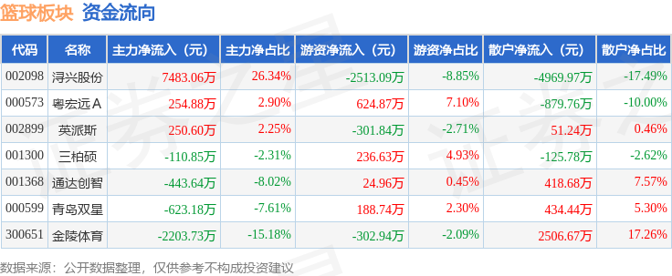 从资金流向上来看,当日篮球板块主力资金净流入4607.14万元,游资资金净流出2042.66万元,散户资金净流出2564.47万元。篮球板块个股资金流向见下表: