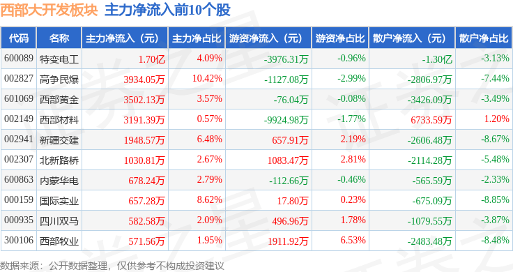 从资金流向上来看,当日西部大开发板块主力资金净流出2.53亿元,游资资金净流出4951.58万元,散户资金净流入3.02亿元。西部大开发板块个股资金流向见下表: