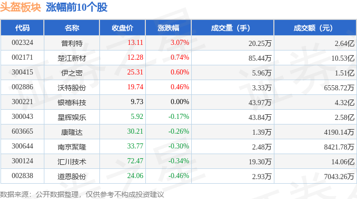 证券之星消息,12月23日头盔板块较上一交易日下跌1.14%,王子新材领跌。当日上证指数报收于3919.98,上涨0.07%。深证成指报收于13368.99,上涨0.27%。头盔板块个股涨跌见下表: