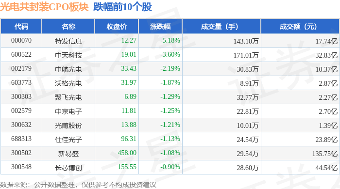 从资金流向上来看,当日光电共封装CPO板块主力资金净流出21.92亿元,游资资金净流入19.1亿元,散户资金净流入2.82亿元。光电共封装CPO板块个股资金流向见下表: