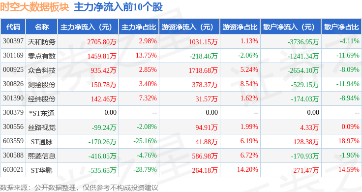 从资金流向上来看,当日时空大数据板块主力资金净流出9.72亿元,游资资金净流入6791.53万元,散户资金净流入9.04亿元。时空大数据板块个股资金流向见下表: