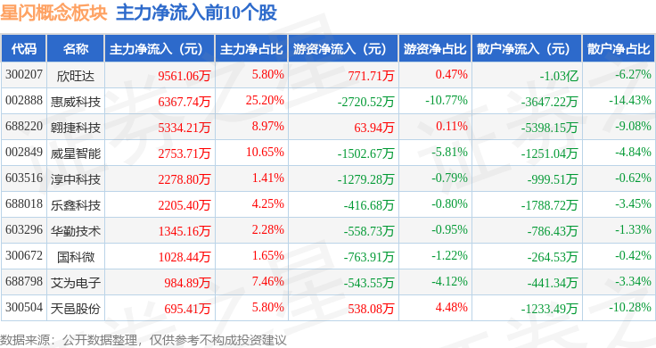 从资金流向上来看,当日星闪概念板块主力资金净流出16.41亿元,游资资金净流入1.58亿元,散户资金净流入14.83亿元。星闪概念板块个股资金流向见下表: