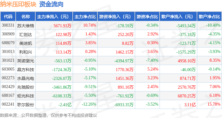 从资金流向上来看,当日纳米压印板块主力资金净流出3.23亿元,游资资金净流出6432.84万元,散户资金净流入3.87亿元。纳米压印板块个股资金流向见下表: