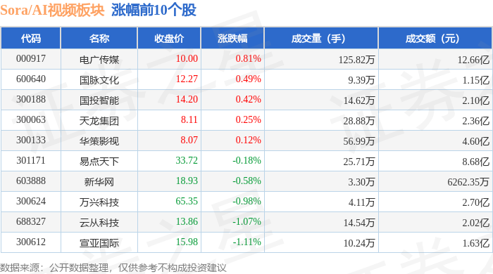 从资金流向上来看,当日Sora/AI视频板块主力资金净流出6.11亿元,游资资金净流入2.39亿元,散户资金净流入3.72亿元。Sora/AI视频板块个股资金流向见下表: