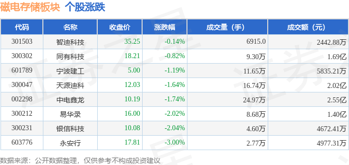 证券之星消息,12月23日磁电存储板块较上一交易日下跌1.72%,永安行领跌。当日上证指数报收于3919.98,上涨0.07%。深证成指报收于13368.99,上涨0.27%。磁电存储板块个股涨跌见下表: