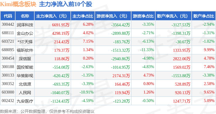 从资金流向上来看,当日Kimi概念板块主力资金净流出1.42亿元,游资资金净流出4624.88万元,散户资金净流入1.88亿元。Kimi概念板块个股资金流向见下表: