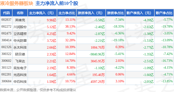 从资金流向上来看,当日液冷服务器板块主力资金净流入28.36亿元,游资资金净流出10.61亿元,散户资金净流出17.74亿元。液冷服务器板块个股资金流向见下表: