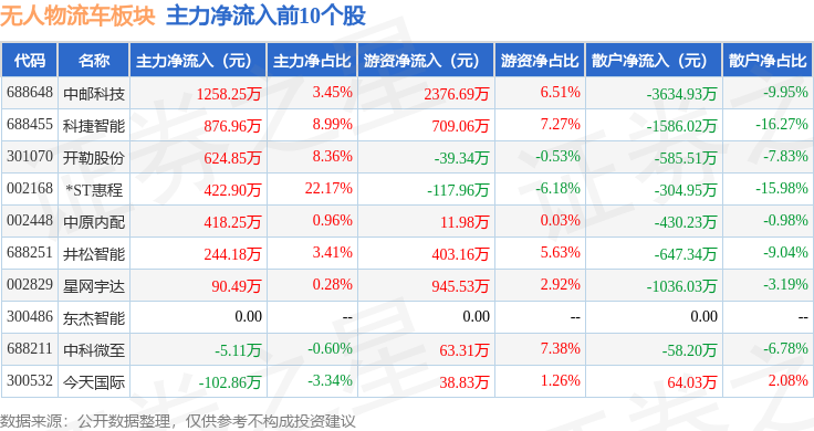 从资金流向上来看,当日无人物流车板块主力资金净流出9.22亿元,游资资金净流入1.49亿元,散户资金净流入7.73亿元。无人物流车板块个股资金流向见下表: