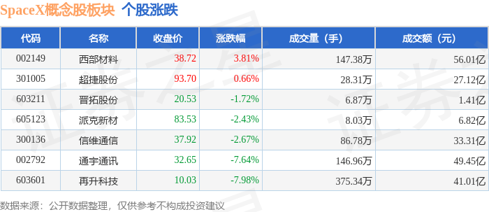 证券之星消息,12月23日SpaceX概念股板块较上一交易日下跌2.19%,再升科技领跌。当日上证指数报收于3919.98,上涨0.07%。深证成指报收于13368.99,上涨0.27%。SpaceX概念股板块个股涨跌见下表: