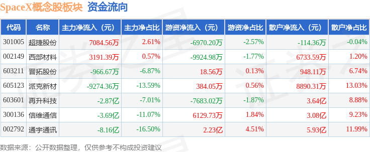 从资金流向上来看,当日SpaceX概念股板块主力资金净流出14.72亿元,游资资金净流入4257.38万元,散户资金净流入14.29亿元。SpaceX概念股板块个股资金流向见下表:
