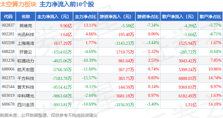 从资金流向上来看,当日太空算力板块主力资金净流出52.15亿元,游资资金净流入2.05亿元,散户资金净流入50.09亿元。太空算力板块个股资金流向见下表: