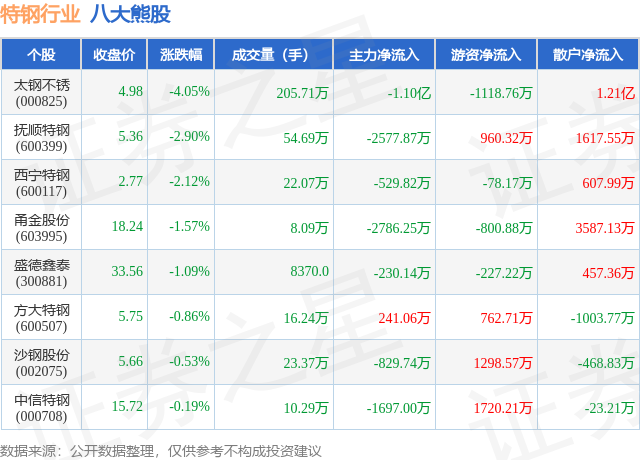 个股表现方面,特钢行业当日领跌股为太钢不锈(000825),该股当日报收4.98,下跌4.05%,成交量205.71万,主力资金净流出1.1亿元。抚顺特钢(600399)以下跌2.9%紧随其后,该股当日成交量54.69万,主力资金净流出2577.87万元。除此之外,西宁特钢(600117)、甬金股份(603995)、盛德鑫泰(300881)均进入当日熊股之列。具体个股列表见下表: