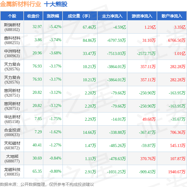 个股表现方面,金属新材料行业当日领跌股为斯瑞新材(688102),该股当日报收32.97,下跌5.42%,成交量67.46万,主力资金净流出4.59亿元。鑫科材料(600255)以下跌3.74%紧随其后,该股当日成交量84.86万,主力资金净流出6797.59万元。除此之外,中洲特材(300963)、天力复合(920576)、天力复合(920576)均进入当日熊股之列。具体个股列表见下表: