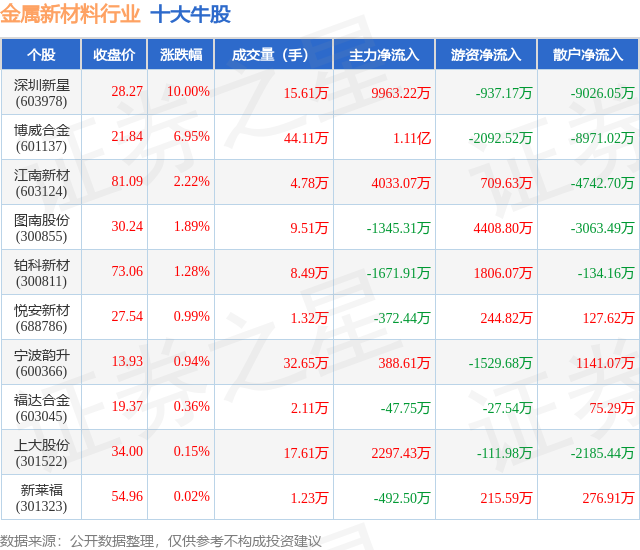 个股表现方面,金属新材料行业当日领涨股为深圳新星(603978),该股当日报收28.27,上涨10.0%,成交量15.61万,主力资金净流入9963.22万元。博威合金(601137)以上涨6.95%紧随其后,该股当日成交量44.11万,主力资金净流入1.11亿元。除此之外,江南新材(603124)、图南股份(300855)、铂科新材(300811)均进入当日牛股之列。具体个股列表见下表: