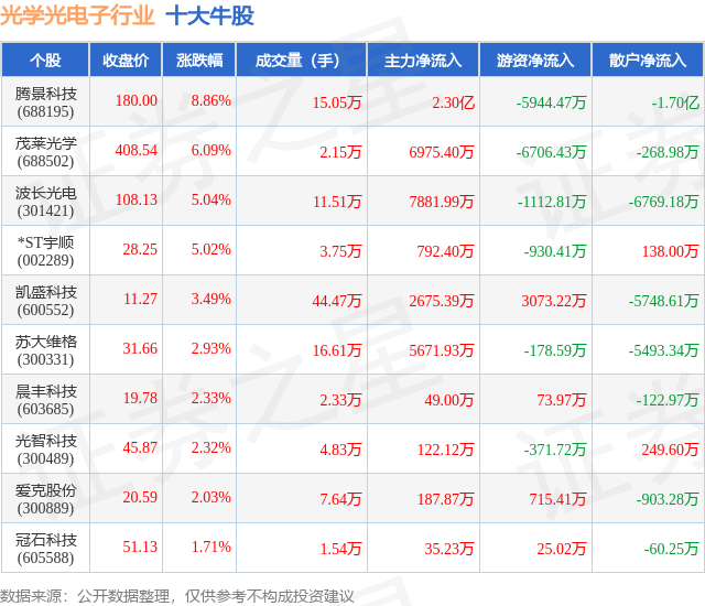个股表现方面,光学光电子行业当日领涨股为腾景科技(688195),该股当日报收180.0,上涨8.86%,成交量15.05万,主力资金净流入2.3亿元。茂莱光学(688502)以上涨6.09%紧随其后,该股当日成交量2.15万,主力资金净流入6975.4万元。除此之外,波长光电(301421)、*ST宇顺(002289)、凯盛科技(600552)均进入当日牛股之列。具体个股列表见下表: