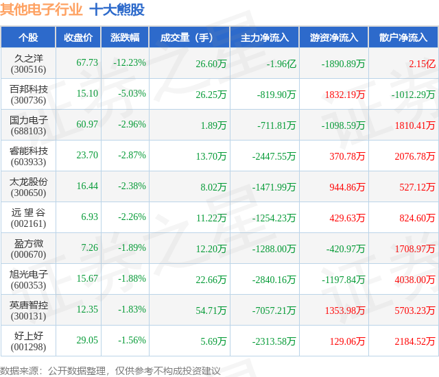 个股表现方面,其他电子行业当日领跌股为久之洋(300516),该股当日报收67.73,下跌12.23%,成交量26.6万,主力资金净流出1.96亿元。百邦科技(300736)以下跌5.03%紧随其后,该股当日成交量26.25万,主力资金净流出819.9万元。除此之外,国力电子(688103)、睿能科技(603933)、太龙股份(300650)均进入当日熊股之列。具体个股列表见下表: