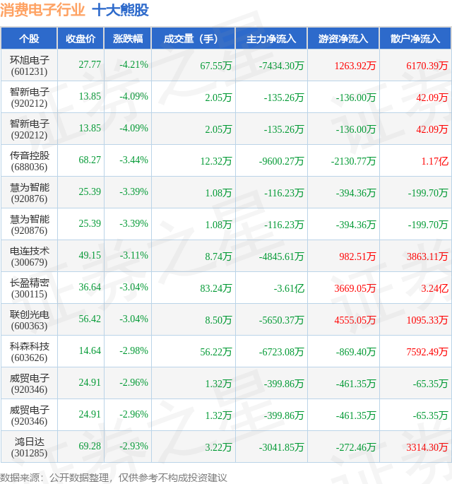 个股表现方面,消费电子行业当日领跌股为环旭电子(601231),该股当日报收27.77,下跌4.21%,成交量67.55万,主力资金净流出7434.3万元。智新电子(920212)以下跌4.09%紧随其后,该股当日成交量2.05万,主力资金净流出135.26万元。除此之外,智新电子(920212)、传音控股(688036)、慧为智能(920876)均进入当日熊股之列。具体个股列表见下表: