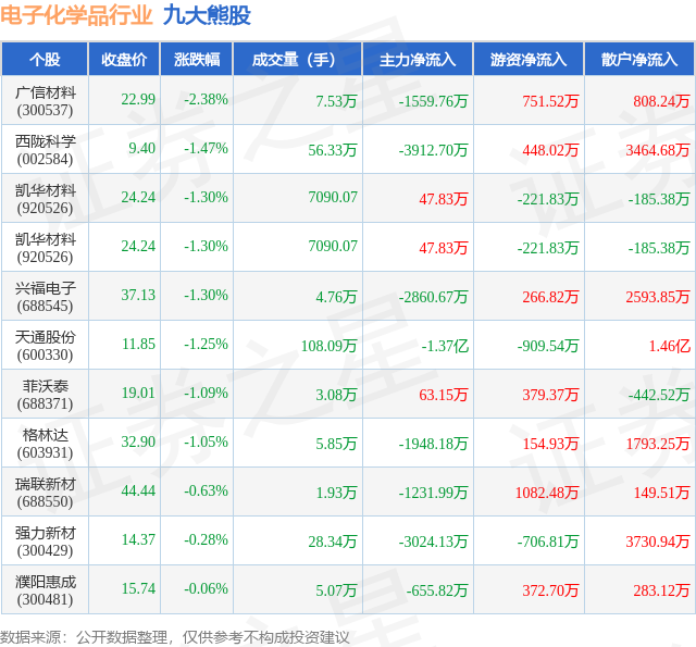 个股表现方面,电子化学品行业当日领跌股为广信材料(300537),该股当日报收22.99,下跌2.38%,成交量7.53万,主力资金净流出1559.76万元。西陇科学(002584)以下跌1.47%紧随其后,该股当日成交量56.33万,主力资金净流出3912.7万元。除此之外,凯华材料(920526)、凯华材料(920526)、兴福电子(688545)均进入当日熊股之列。具体个股列表见下表: