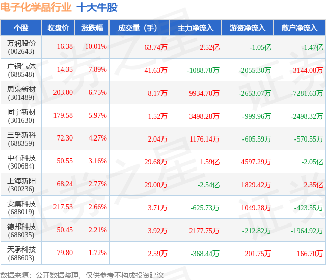 个股表现方面,电子化学品行业当日领涨股为万润股份(002643),该股当日报收16.38,上涨10.01%,成交量63.74万,主力资金净流入2.52亿元。广钢气体(688548)以上涨7.89%紧随其后,该股当日成交量41.63万,主力资金净流出1088.78万元。除此之外,思泉新材(301489)、同宇新材(301630)、三孚新科(688359)均进入当日牛股之列。具体个股列表见下表: