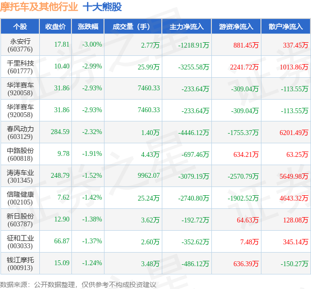 个股表现方面,摩托车及其他行业当日领跌股为永安行(603776),该股当日报收17.81,下跌3.0%,成交量2.77万,主力资金净流出1218.91万元。千里科技(601777)以下跌2.99%紧随其后,该股当日成交量25.99万,主力资金净流出3255.58万元。除此之外,华洋赛车(920058)、华洋赛车(920058)、春风动力(603129)均进入当日熊股之列。具体个股列表见下表: