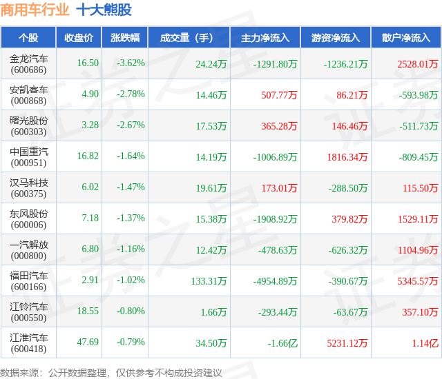 个股表现方面,商用车行业当日领跌股为金龙汽车(600686),该股当日报收16.5,下跌3.62%,成交量24.24万,主力资金净流出1291.8万元。安凯客车(000868)以下跌2.78%紧随其后,该股当日成交量14.46万,主力资金净流入507.77万元。除此之外,曙光股份(600303)、中国重汽(000951)、汉马科技(600375)均进入当日熊股之列。具体个股列表见下表: