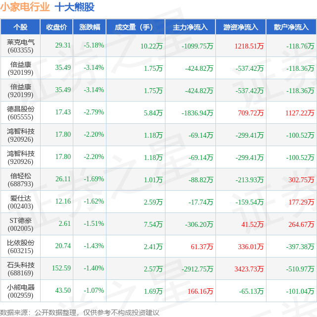 个股表现方面,小家电行业当日领跌股为莱克电气(603355),该股当日报收29.31,下跌5.18%,成交量10.22万,主力资金净流出1099.75万元。倍益康(920199)以下跌3.14%紧随其后,该股当日成交量1.75万,主力资金净流出424.82万元。除此之外,倍益康(920199)、德昌股份(605555)、鸿智科技(920926)均进入当日熊股之列。具体个股列表见下表: